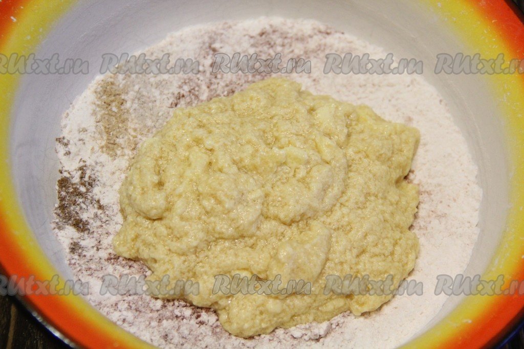 Перемешать всё с помощью миксера до однородного состояния. Выложить получившуюся массу в миску с мучной смесью.