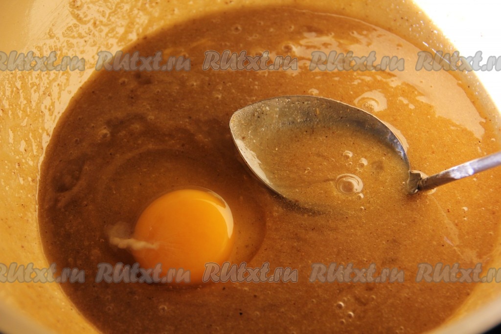 Снять массу с водяной бани и ввести по одному яйцу, каждый раз тщательно взбивая.