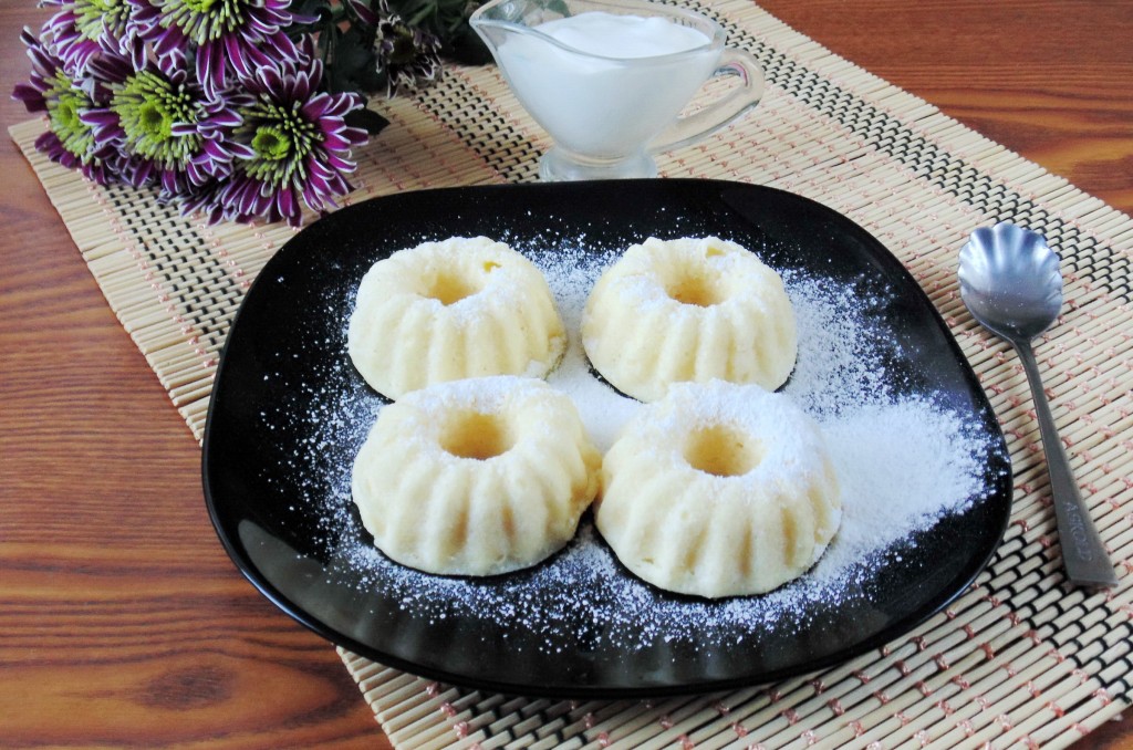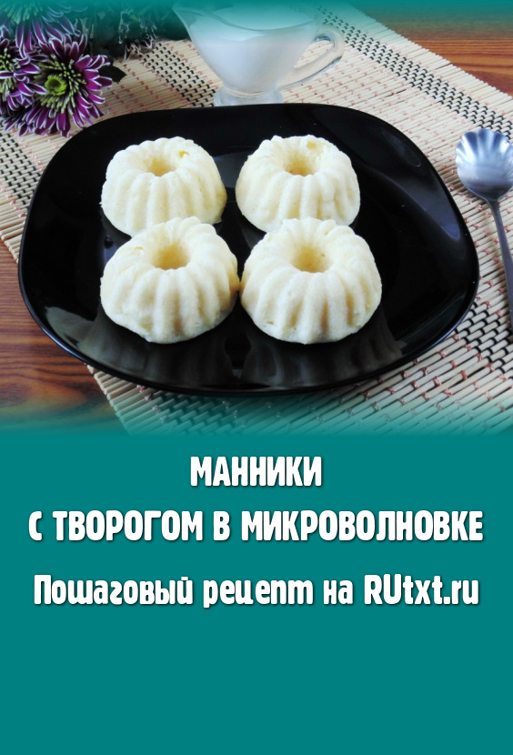 Достать формочки из микроволновки, дать немного остыть, а затем нежные, вкусные манники, приготовленные с творогом, вынуть из формочек и подать к столу со сметаной, вареньем или мёдом.
