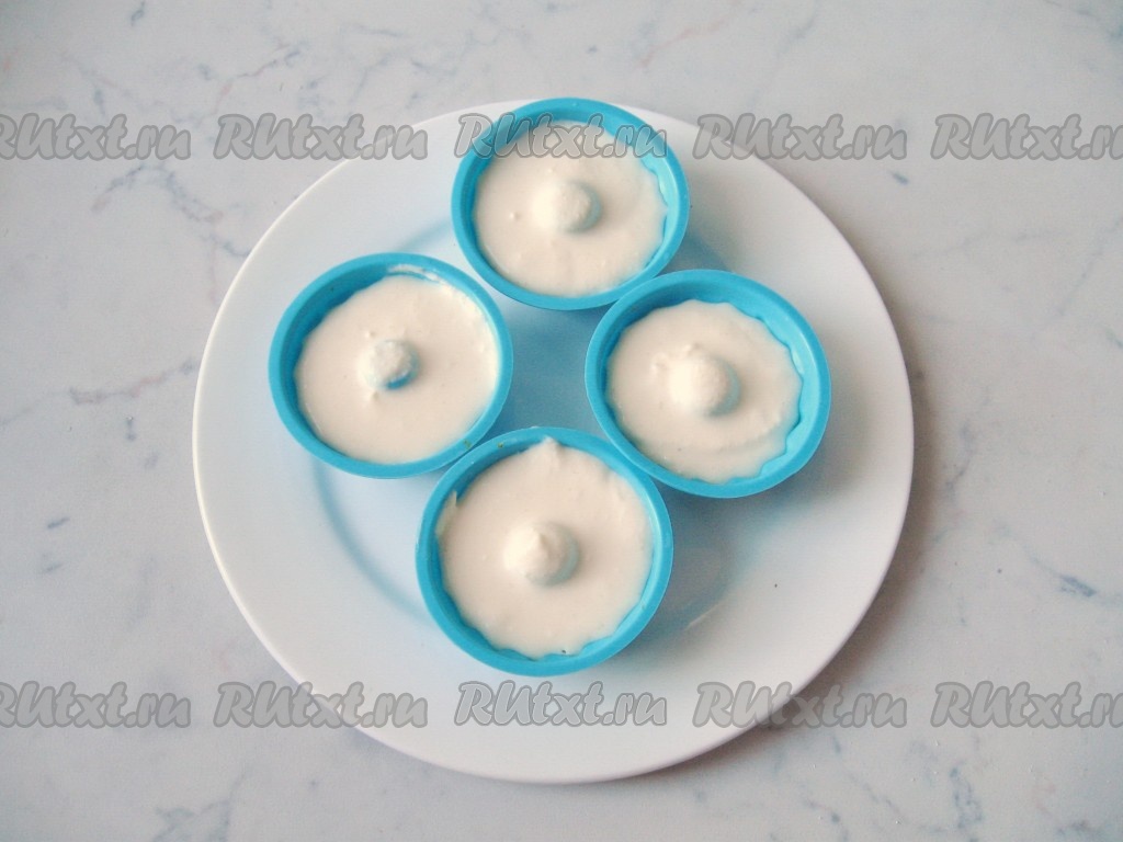 Творожное тесто разложить по силиконовым формочкам, заполняя их на 2/3 объёма, поставить в микроволновку.