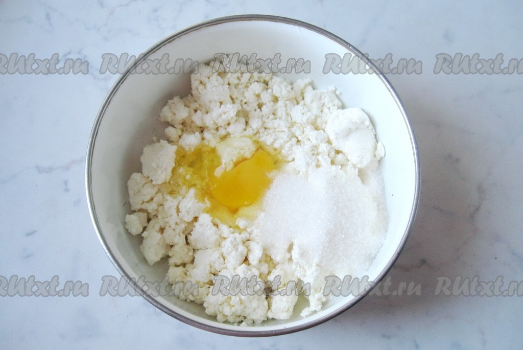 К творогу добавить яйцо, соль, сахар и перемешать.