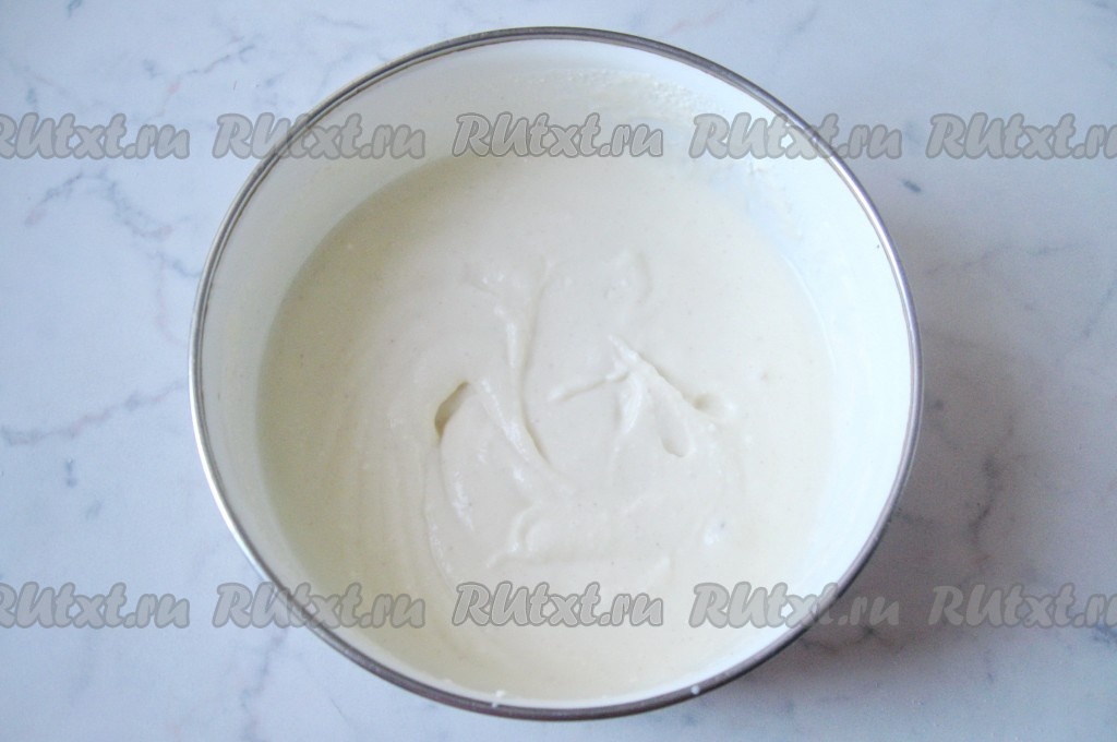 Добавить молоко в смесь творога, сахара, соли, яйца и манной крупы. Тщательно перемешать или взбить погружным блендером. Оставить постоять минут на 5, чтобы манка немного набухла. Тесто для творожных манников должно получиться гладким, однородным, как в меру густой крем.