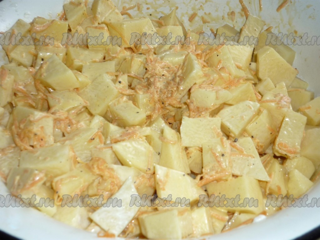 Картофель нарезать средними кубиками, посолить и поперчить. Морковь натереть на средней тёрке, добавить к картошке, влить сметану и перемешать.