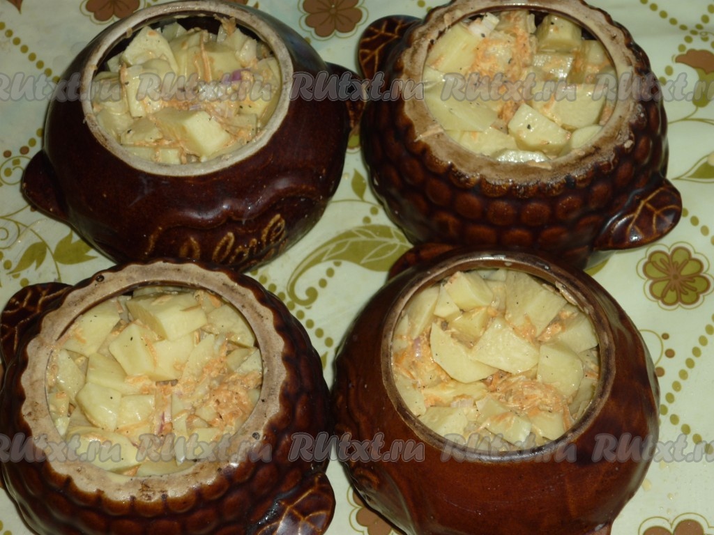 На дно горшочка влить по 1 столовой ложке жира, который выделился при обжаривания утки. Положить мясо, сверху - картофель с морковью.