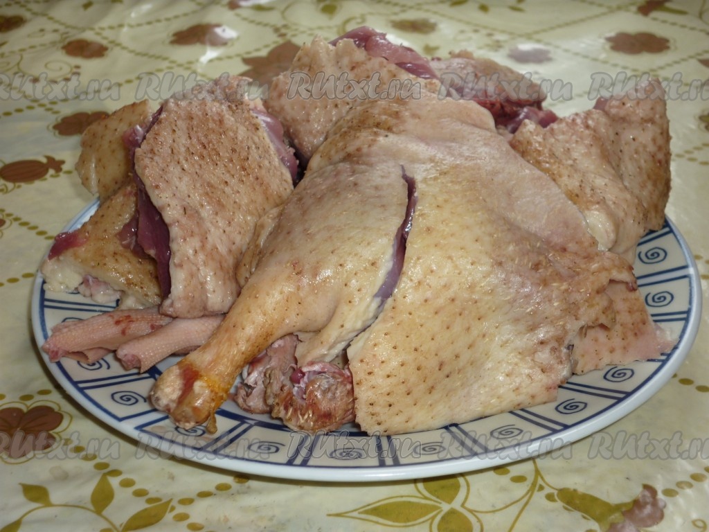 Утку вымыть, обсушить и нарезать на порционные кусочки.