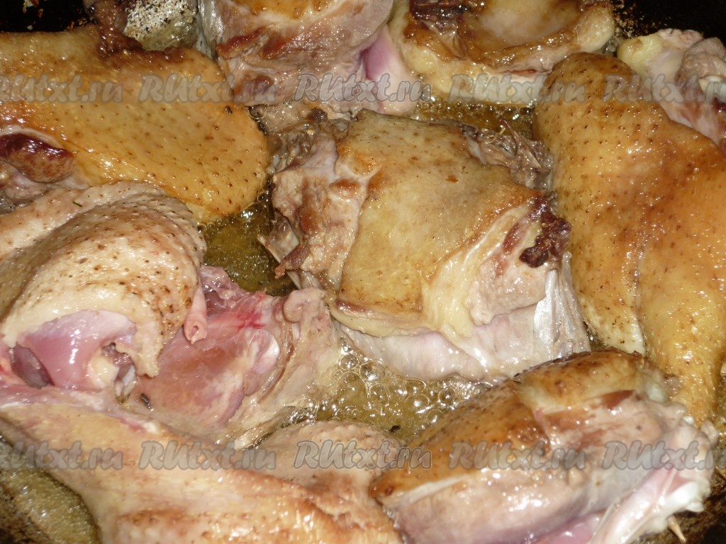 Обжарить утиное мясо на небольшом количестве растительного масла до золотистой корочки со всех сторон, посолить и поперчить по вкусу.