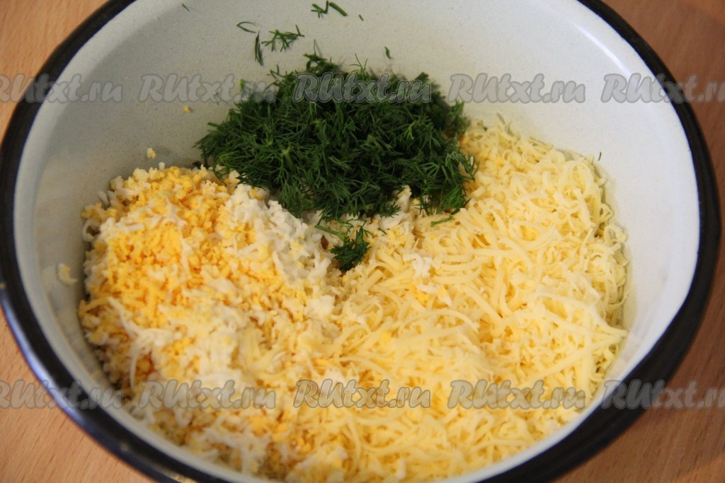 Подготовить начинку для наших котлет. Яйца предварительно сварить вкрутую, затем остудить, почистить и натереть на мелкой тёрке. Сыр натереть на мелкой тёрке. Зелень вымыть, обсушить (я использовала только укроп) и мелко нарезать. В глубокой миске соединить измельченный сыр, яйца, зелень и тщательно перемешать начинку для котлет.