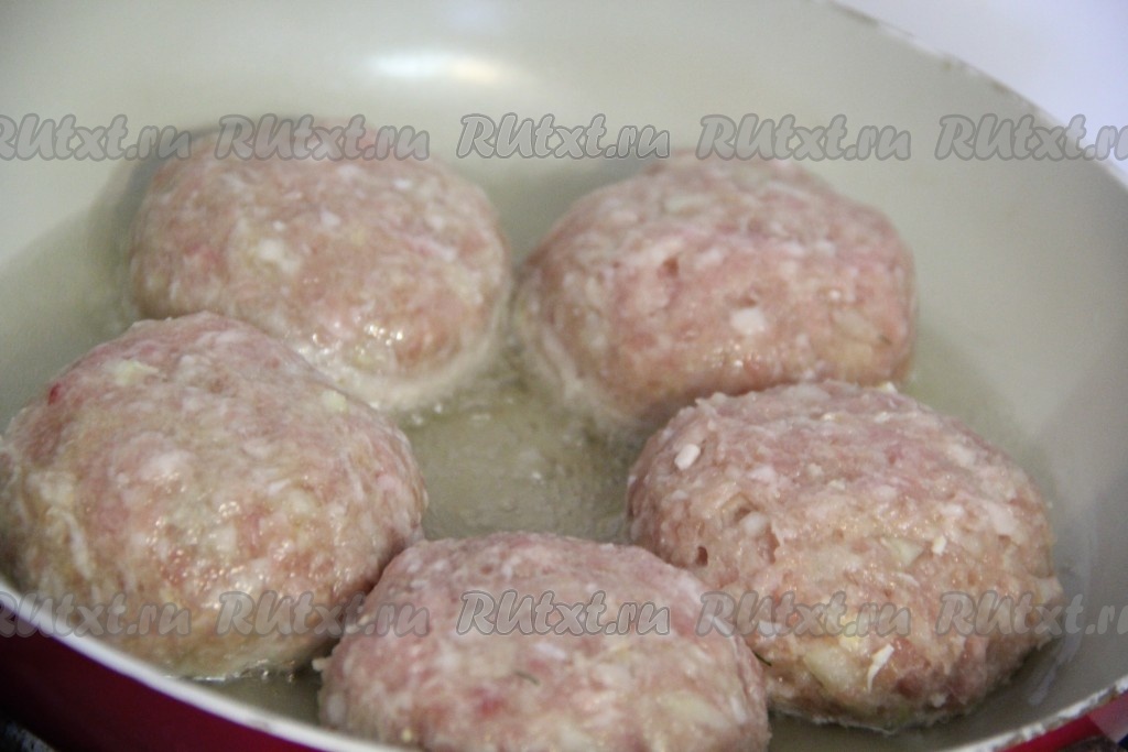 В сковороду влить растительное масло и поставить на огонь. Выложить получившиеся котлеты с начинкой на хорошо разогретую сковороду. Обжарить наши котлеты на среднем огне до румяной корочки с двух сторон.