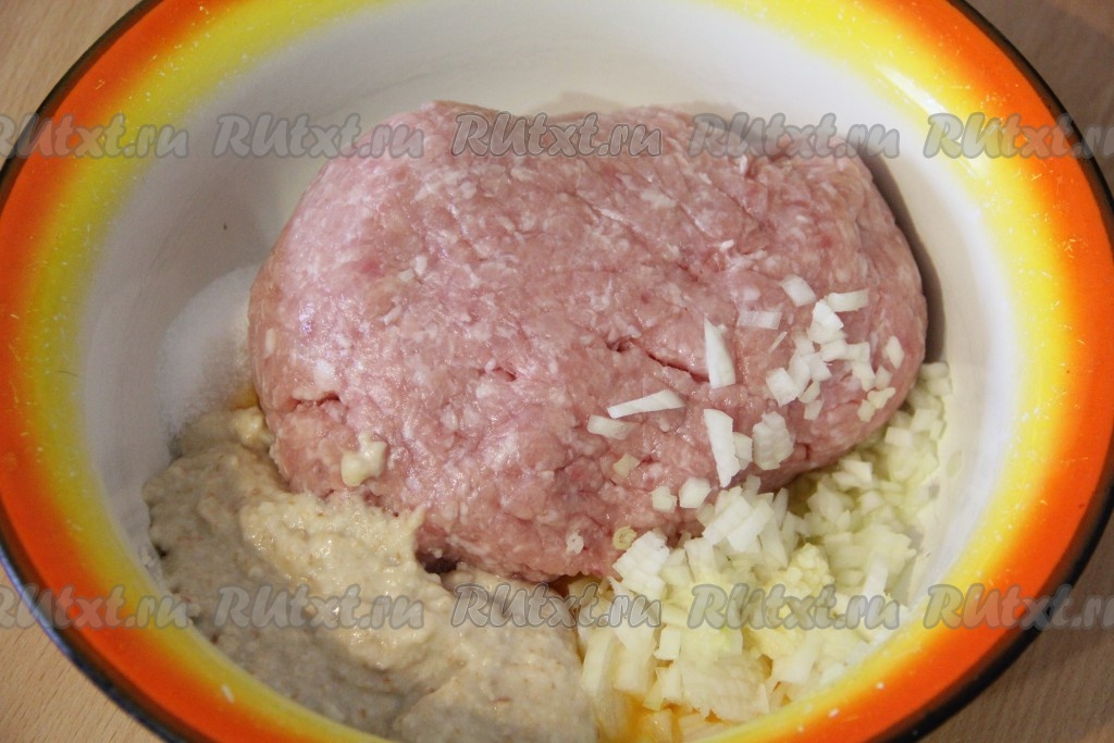 Кусочки белого хлеба залить молоком и дать немного размягчиться. Затем с помощью вилки или блендера размять хлеб до однородного состояния. Чеснок почистить и пропустить через пресс. Лук почистить и мелко нарезать. Можно измельчить лук с помощью мясорубки или измельчителя. В глубокой миске соединить фарш, хлебное пюре, яйцо, лук. Добавить соль и специи по вкусу. Тщательно вымесить фарш.