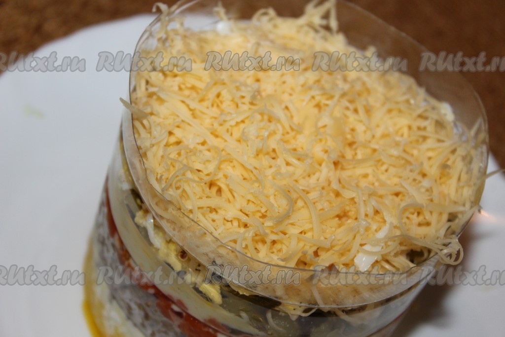 Натереть сыр на мелкой терке и выложить поверх яиц. Накрыть слоеный салат с куриной печенью пищевой пленкой и убрать в холодильник примерно на 30 минут.
