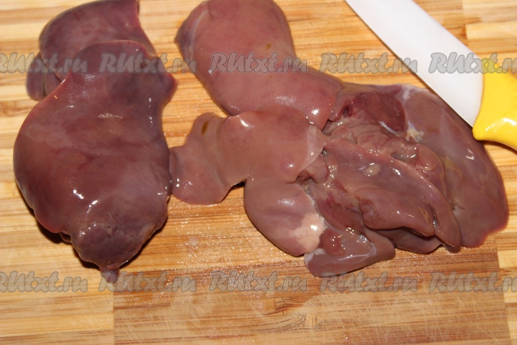 Куриную печень тщательно промыть под проточной водой, очистить от пленок и прожилок.