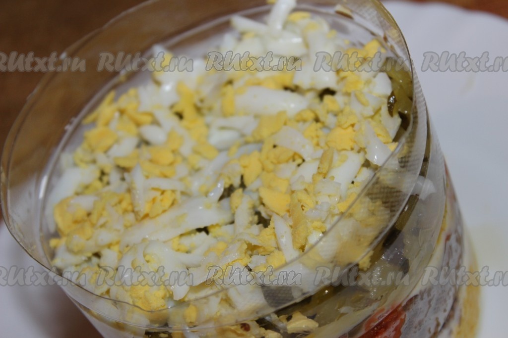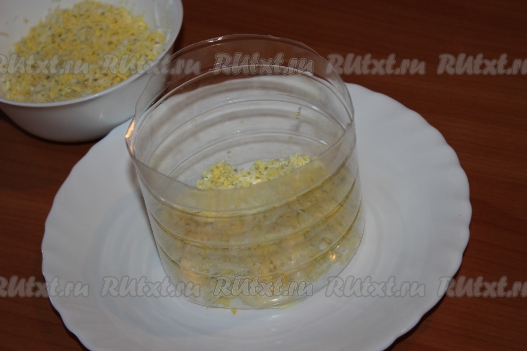 Яйца отварить вкрутую, охладить, очистить, натереть на средней терке. На плоскую тарелку поставить бортики для формирования салата. Я сделала бортики, разрезав пластиковую бутылку. Часть яиц, натертых на терке, выложить первым слоем, немного посолить, слегка смазать майонезом.