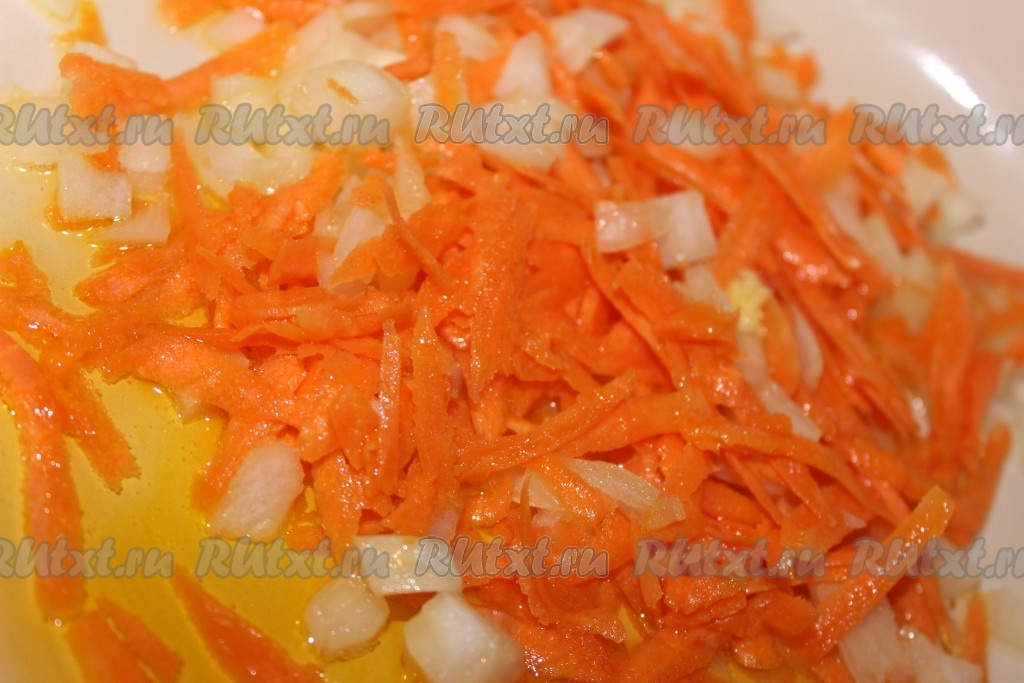 В сковороду с разогретым растительным маслом добавить нарезанный лук и обжарить на среднем огне, периодически помешивая, до легкого золотистого цвета. Натертую морковь добавить в сковороду к луку. Обжарить овощи на среднем огне примерно 5-7 минут, не забывая иногда перемешивать.