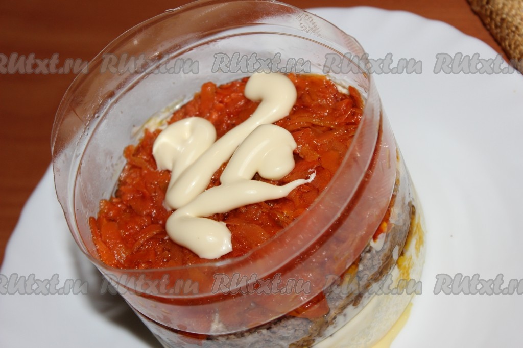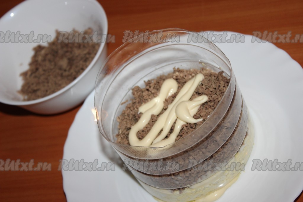 Следующим слоем выложить натертую куриную печень, смазать майонезом.