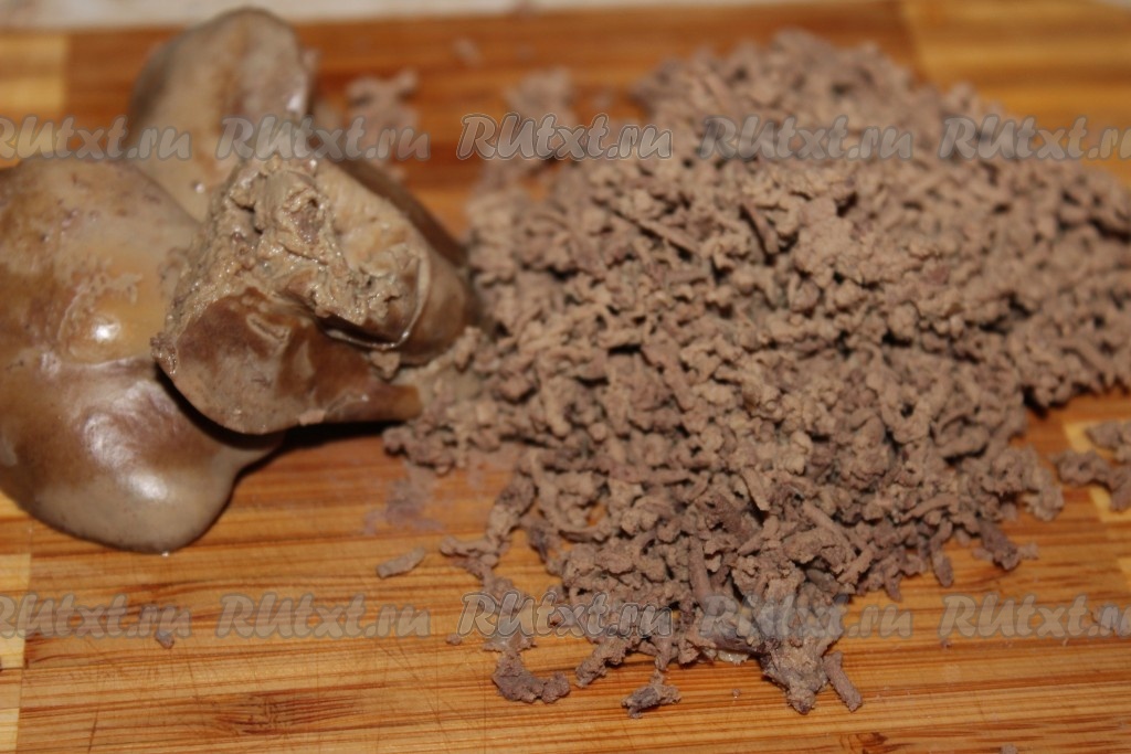 В кастрюлю налить холодную воду, поместить туда куриную печень, довести до кипения, посолить, уменьшить огонь и варить 10 минут. Остудить, натереть на средней терке.
