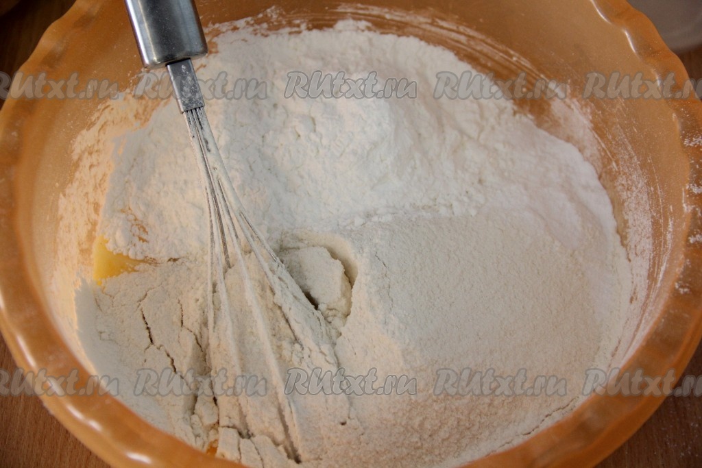 Затем всыпать просеянную муку и добавить разрыхлитель с крахмалом.