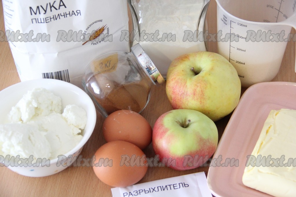 Подготовить продукты для приготовления теста. Яблочки должны быть среднего размера. Творог можно взять любой жирности, если творог с крупинками, лучше протереть его через сито.