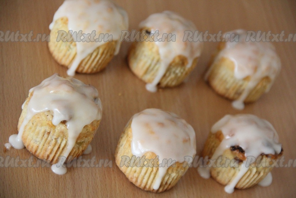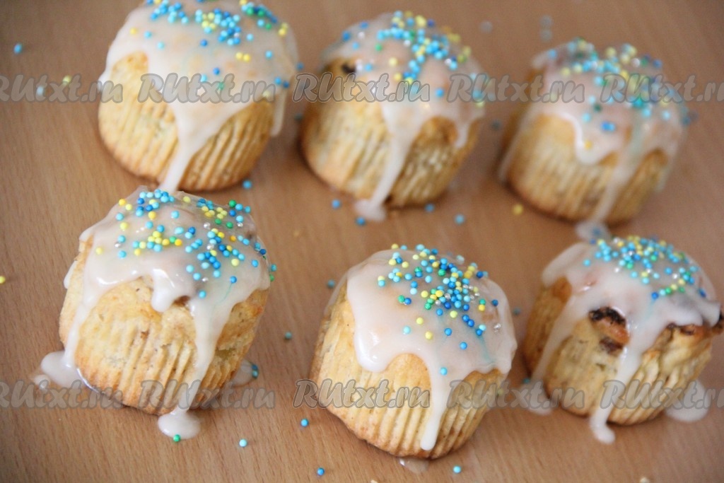 Покрыть пасхальные кексы глазурью, как на фото.