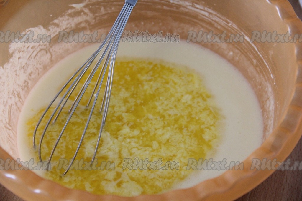Сливочное масло растопить и слегка остудить. Влить масло в творожно-яичную смесь. Всё тщательно перемешать до однородного состояния.