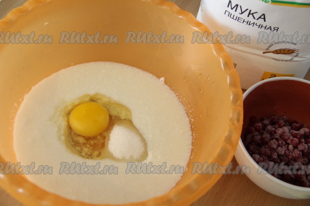 В глубокой миске соединить кефир, яйцо и сахар, перемешать венчиком до однородности.