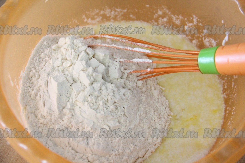 Всыпать разрыхлитель, ванилин и половину муки, перемешать венчиком.