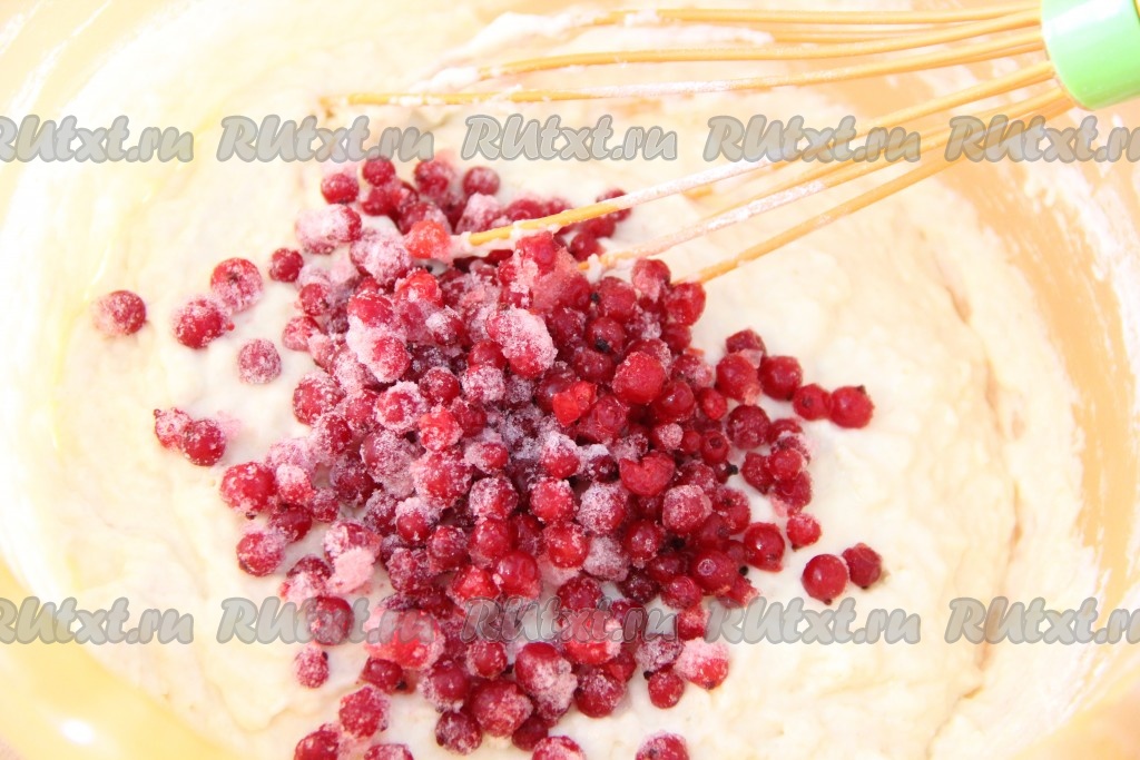 Затем начать по столовой ложке добавлять оставшуюся муку, каждый раз вмешивая её в тесто. Нужно добиться, чтобы консистенция теста напоминала достаточно густую сметану. Как только добились такой консистенции, значит больше муку не добавляйте. Добавить в тесто ягоды смородины и перемешать. Вмешивать ягоды нужно аккуратно, смородина должна равномерно распределиться по всему тесту, но при этом желательно сохранить целостность ягодок.