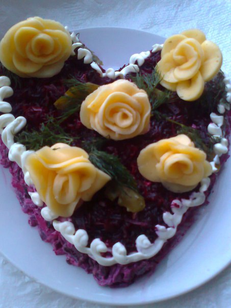 майонезом и листиками из огурца и зеленью. Наш салат из свеклы, чернослива, грецких орехов и сыра готов.