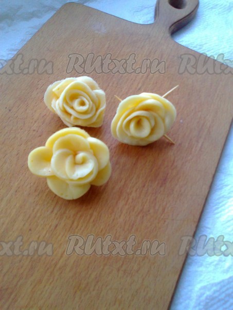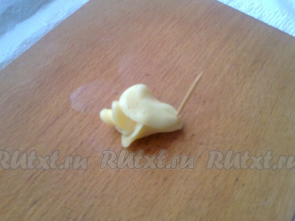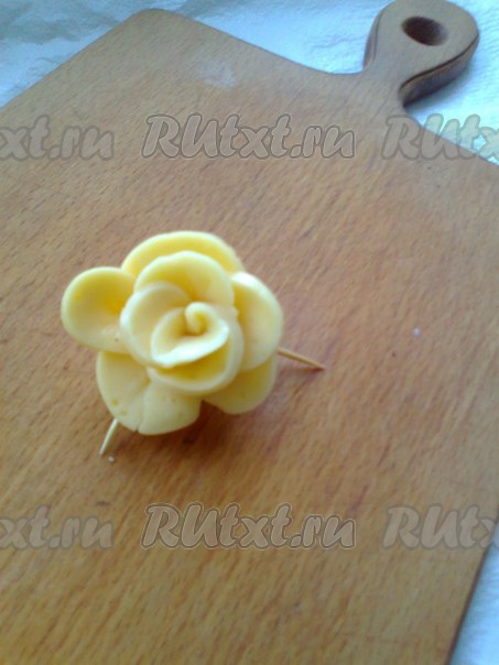 Поставить розу для охлаждения в холод, завернув в пищевую пленку. После охлаждения розы зубочистки вытащить. Вот такие розы из сыра получились.