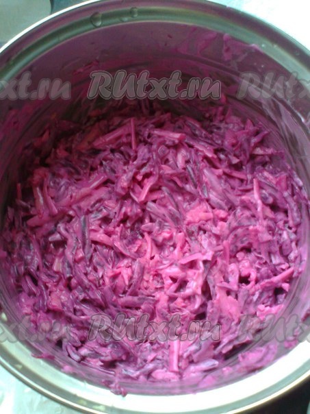 Для приготовления салата необходимо запечь или отварить свеклу до готовности, ориентировочно 1-1,5 часа. Очистить ее и натереть 2 свеклы на крупной терке, а 1 свеклу (для украшения верха салата) натереть отдельно на средней терке. Сыр для салата (100 грамм) натереть на крупной терке, добавить к свекле.