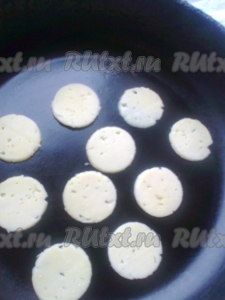 Сухую сковороду нагревать в течение 1 минуты, затем выключить и выложить в нее кружочки сыра, чтобы слегка размягчились.