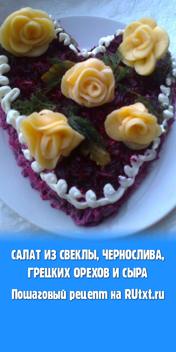 Салат из свеклы, чернослива, грецких орехов и сыра - вкусный, полезный и несложный в приготовлении. Такое блюдо можно приготовить как в будние дни, так и в праздничные, красиво украсив его, например,  розами из сыра и зеленью.