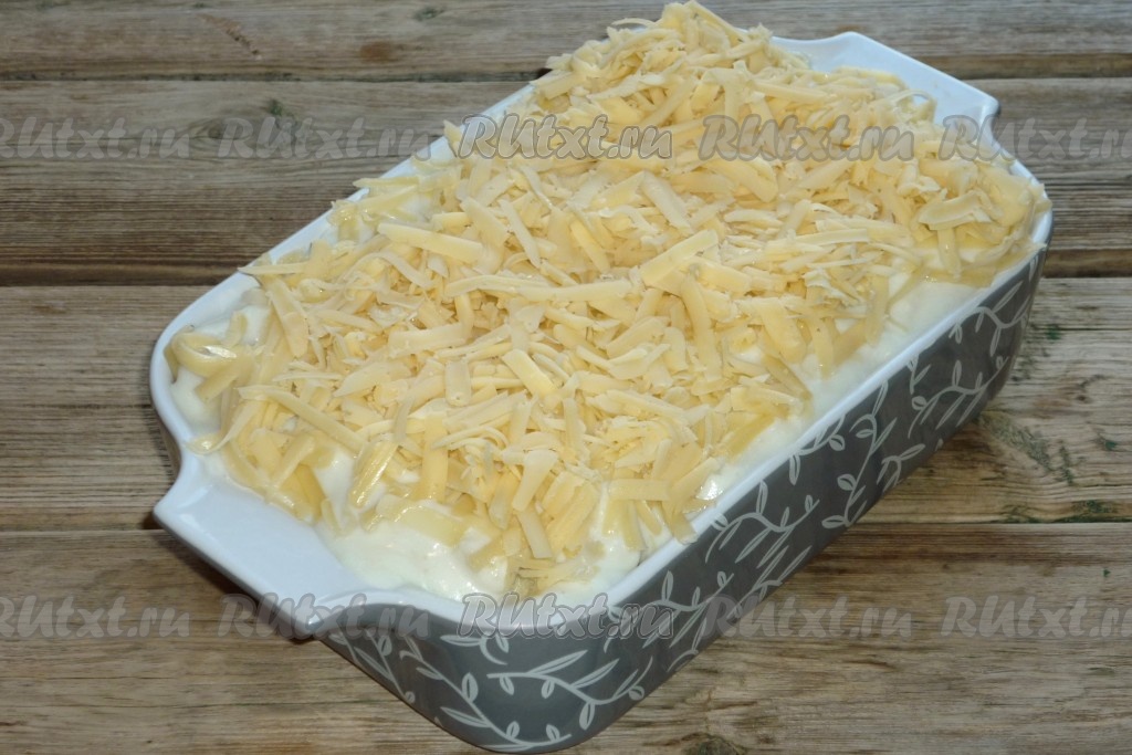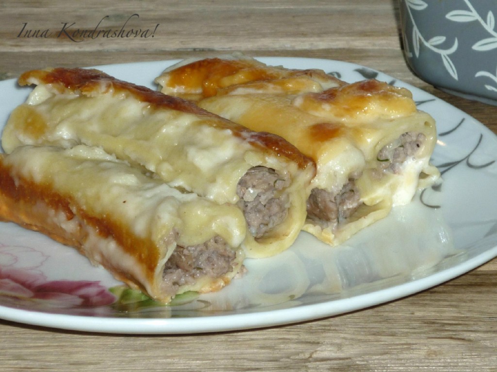 Домашние каннеллони с фаршем залить соусом "Бешамель". Сверху посыпать натёртым сыром.