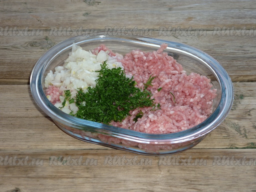 Укроп вымыть, мелко нарезать. Лук очистить, нарезать на мелкие кубики. В миску с фаршем добавить лук и укроп. Посолить, поперчить фарш по вкусу и тщательно перемешать.