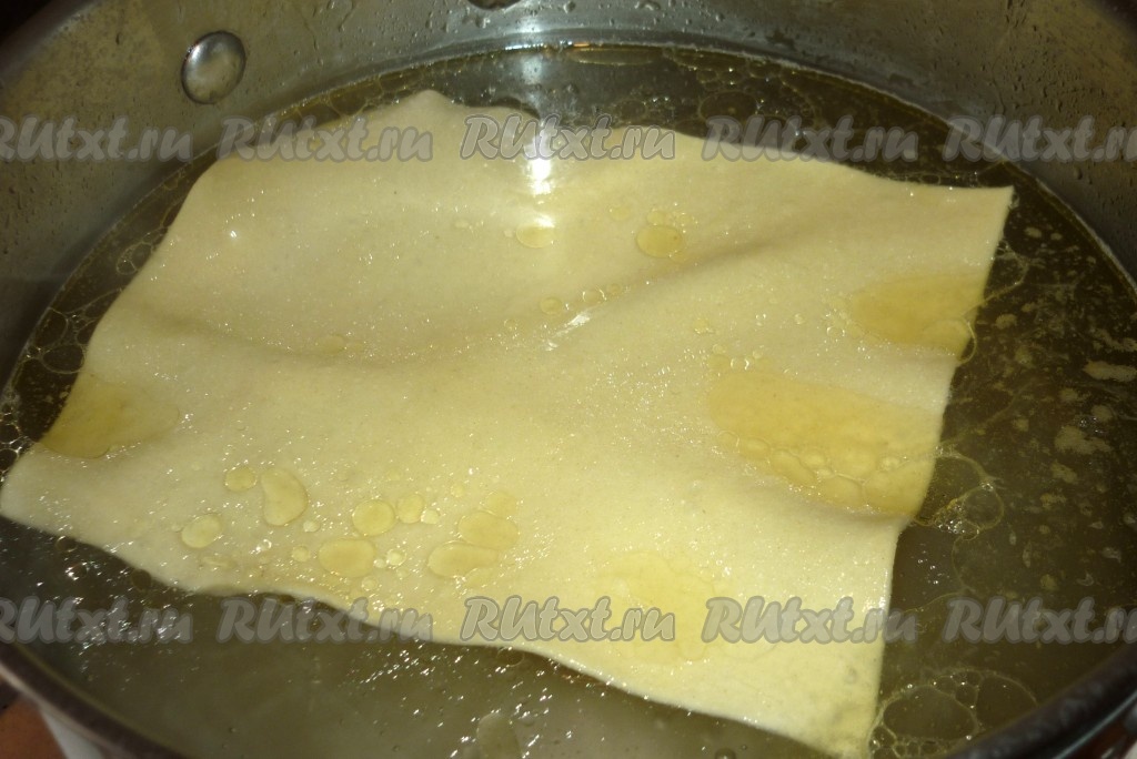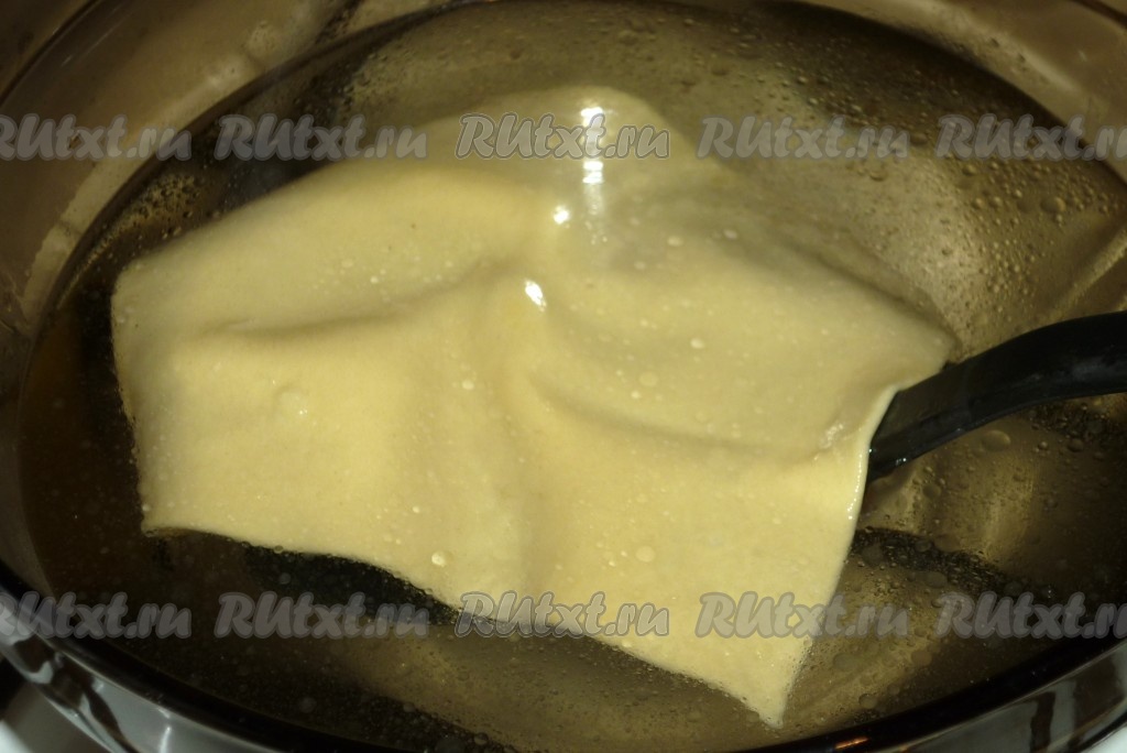 В кастрюле вскипятить воду. Добавить соль и растительное масло. Отправить первый прямоугольник теста в кипяток, проварить 30 секунд.
