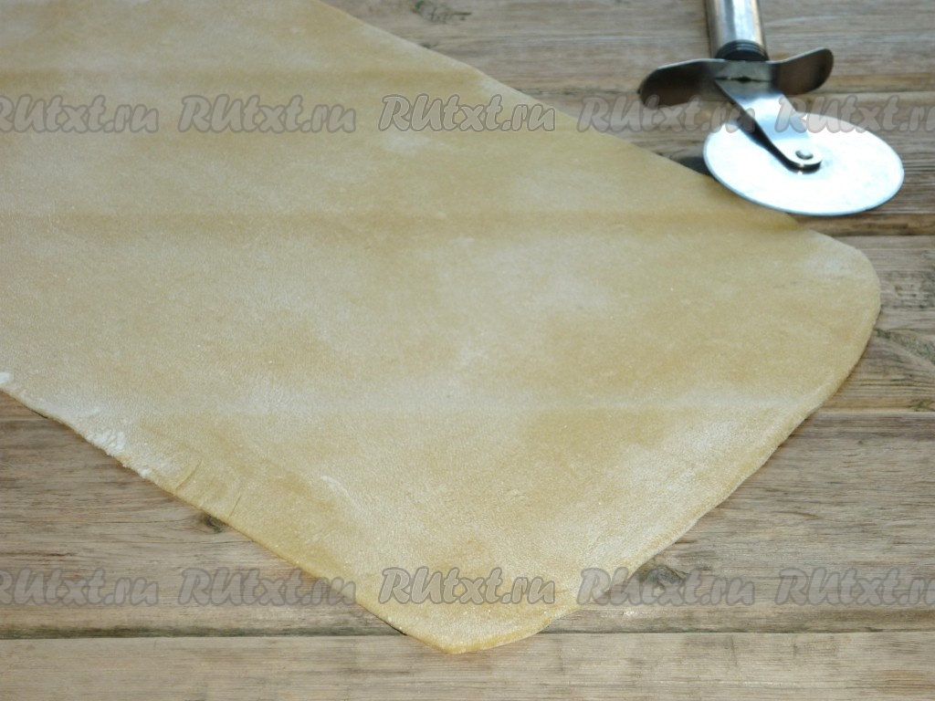 Тесто разделить пополам. На столе, присыпанном мукой, каждую часть теста раскатать максимально тонко.