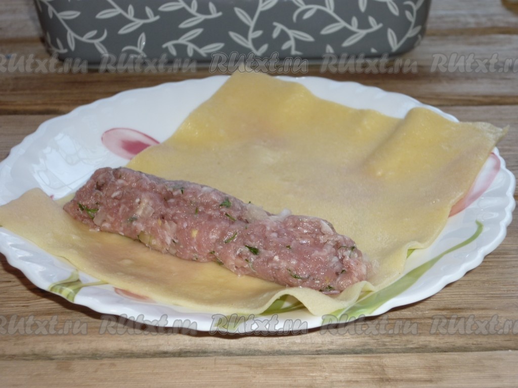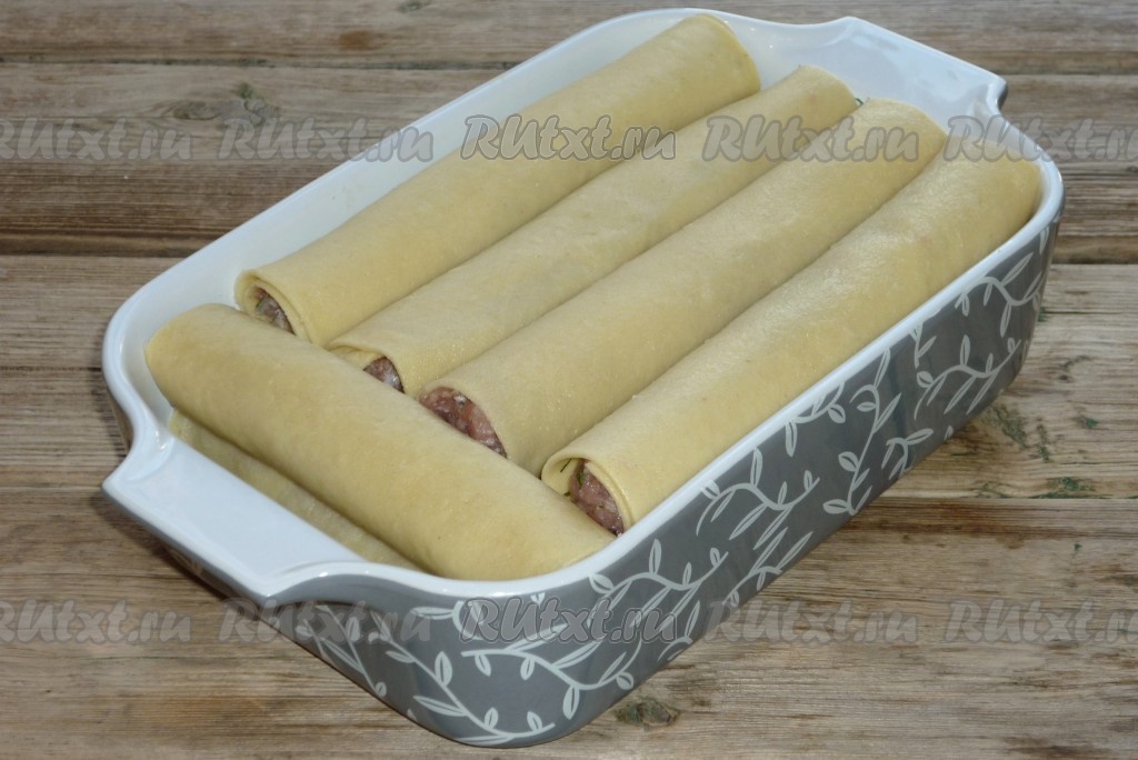 Свернуть тесто в трубочку, начиная со стороны с фаршем, и выложить в жаропрочную форму. Аналогично сформировать все домашние фаршированные каннеллони, выкладывая их в форму.