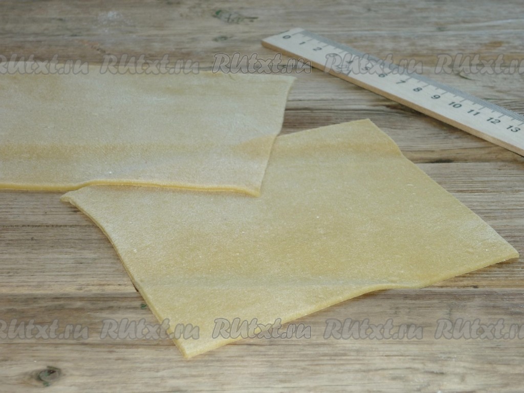 У нас получатся 2 тонко раскатанных пласта теста. Каждый полученный пласт разрезать на прямоугольники размером примерно 12х14 сантиметров. Всего у меня получилось 12 штук.