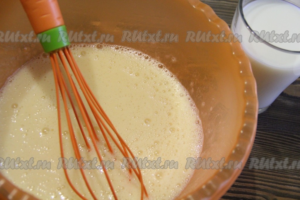 Масса посветлеет и запузырится, даже увеличится в объёме. Затем влить молоко и перемешать.