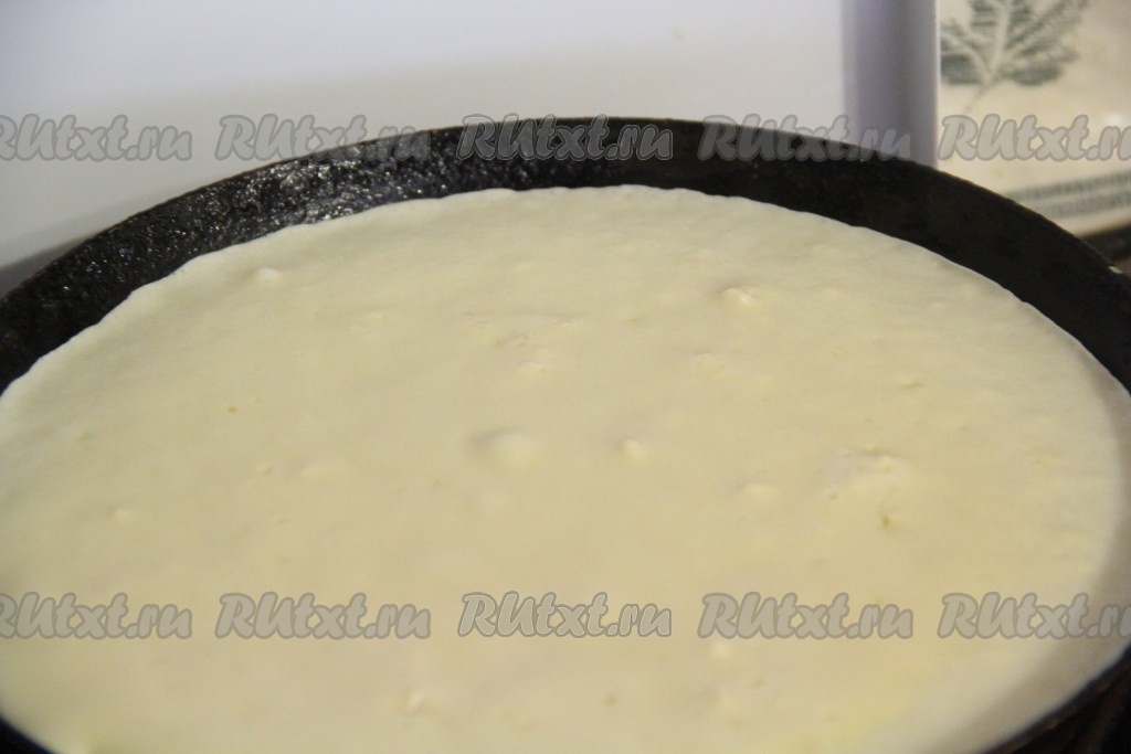 Сковороду смазать растительным маслом и очень хорошо разогреть. Я с помощью кисточки смазала сковороду маслом только перед жаркой первого блина. Влить немного теста и хорошо его распределить по сковороде, жарить блинчик на среднем огне.