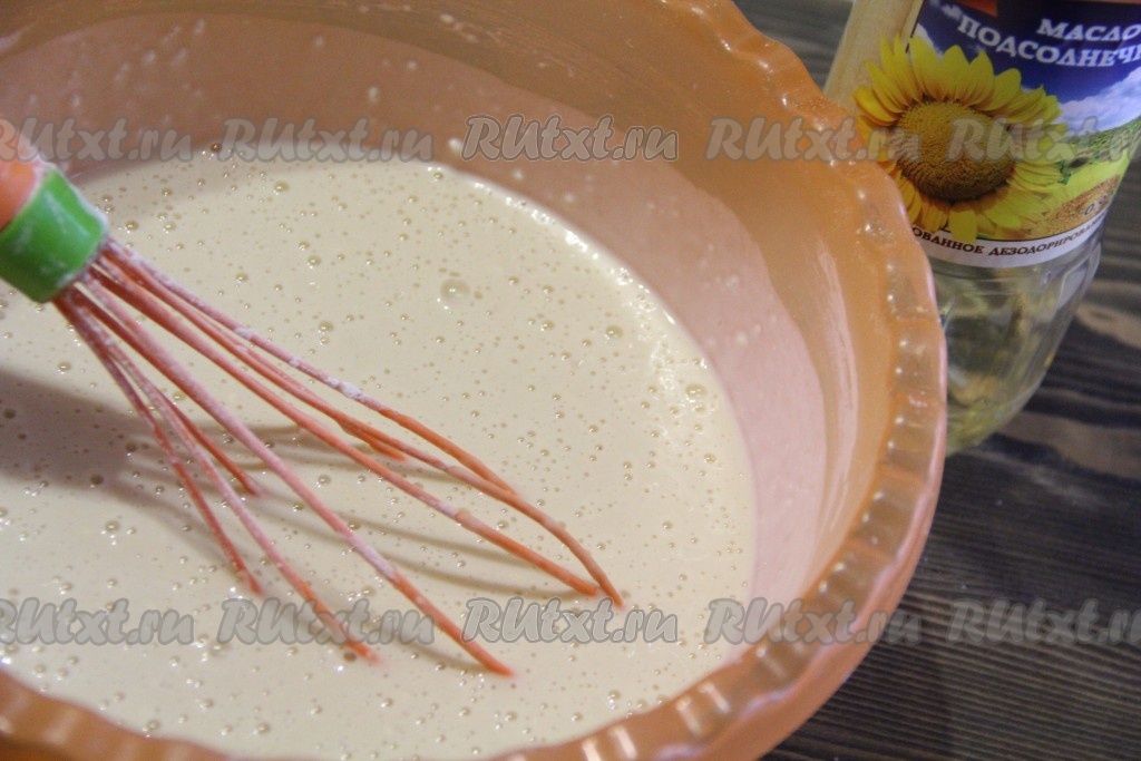 Хорошо перемешать тесто до однородного состояния. Влить растительное масло в тесто и тщательно перемешать. Тесто должно получиться гладким и не густым.