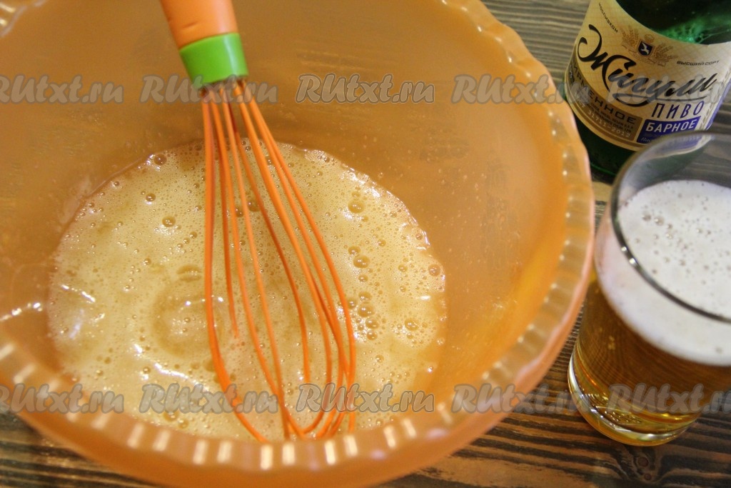 С помощью венчика взбить яйца с сахаром и солью в пышную массу. Далее влить в яичную массу пиво и тщательно перемешать.