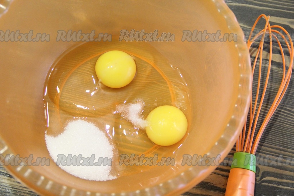 В глубокую миску вбить яйца, добавить сахар и соль.