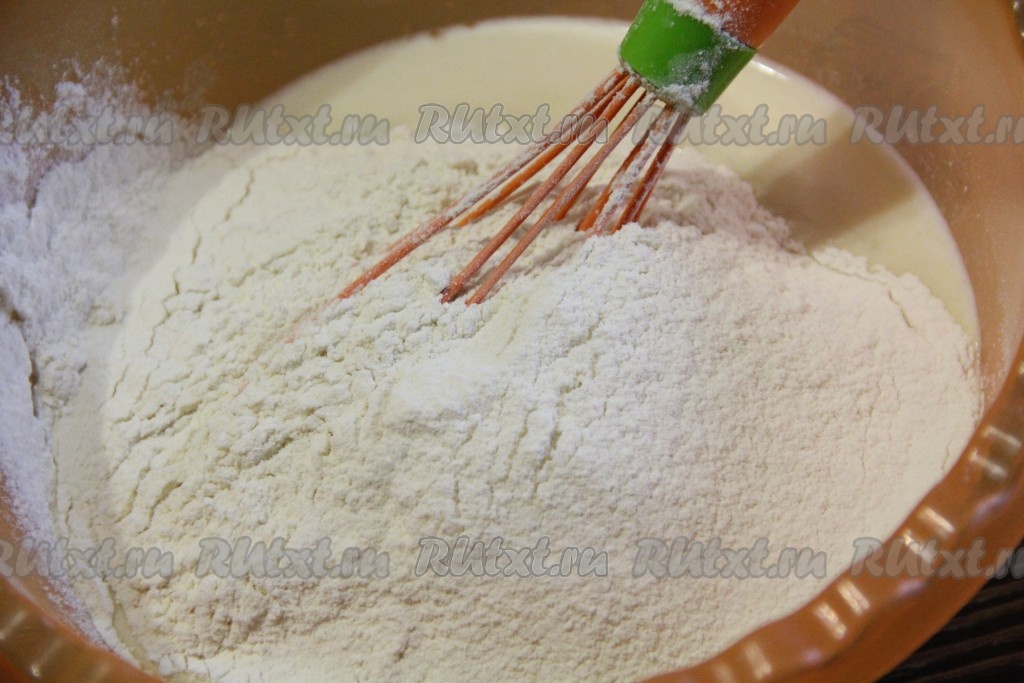 Сюда же добавить соду, погашенную лимонным соком (или уксусом), а затем всыпать просеянную муку.