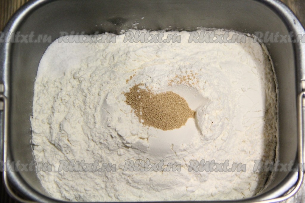 Далее добавить просеянную муку, соль и дрожжи. Последовательность закладки продуктов смотрите в инструкции к вашей хлебопечке. Выставить режим хлебопечки "Основной" или "Белый хлеб", у меня этот режим длится 3 часа 30 минут, вес - 750 грамм, цвет корочки - средний.