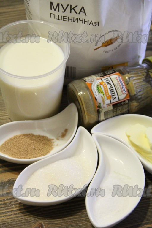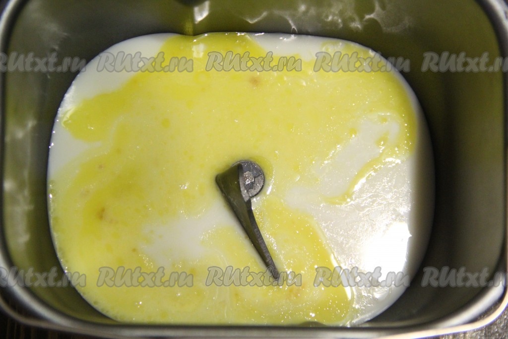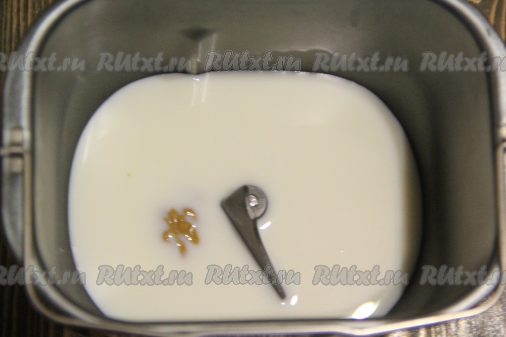 В ведёрко хлебопечки влить молоко, добавить сахар и горчицу.
