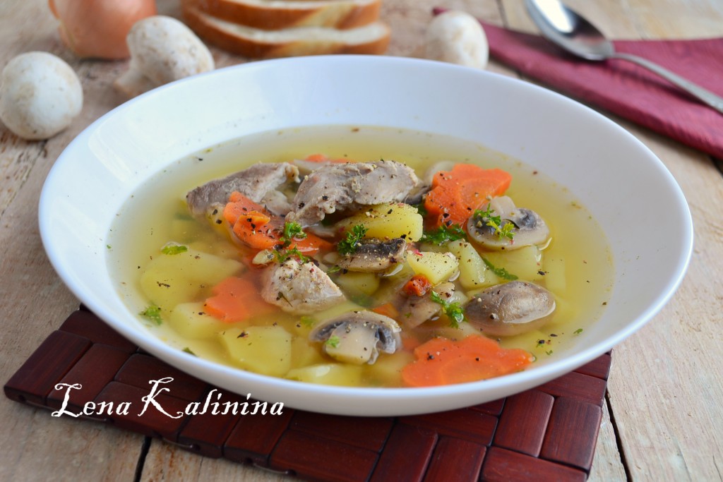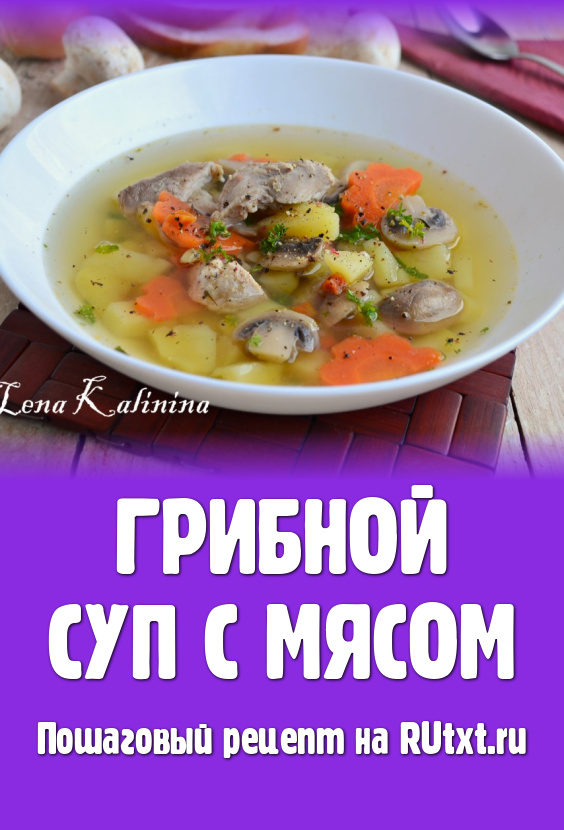 Для разнообразия вашего повседневного обеденного стола предлагаю приготовить грибной суп с мясом. Блюдо получается очень вкусным, легким и ароматным. Готовится суп без зажарки, совершенно без жира, только на мясном бульоне. Попробуйте, вам обязательно понравится этот супчик!