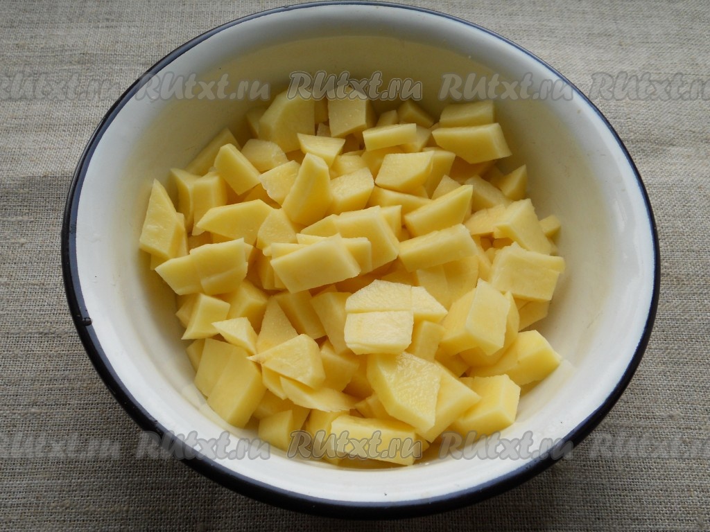 Мясо нарезать средними кусочками, поместить в кастрюлю.