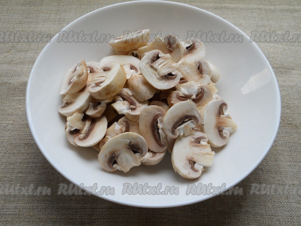 Шампиньоны нарезать не слишком тонкими пластинами.