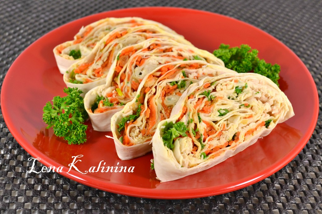 Поместить рулет в целлофан или завернуть в фольгу и отправить в холодильник на пару часов. После этого необычайно вкусный рулет из лаваша с курицей и морковкой нарезать на кусочки, выложить на тарелку и подать к столу.
