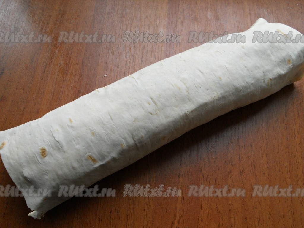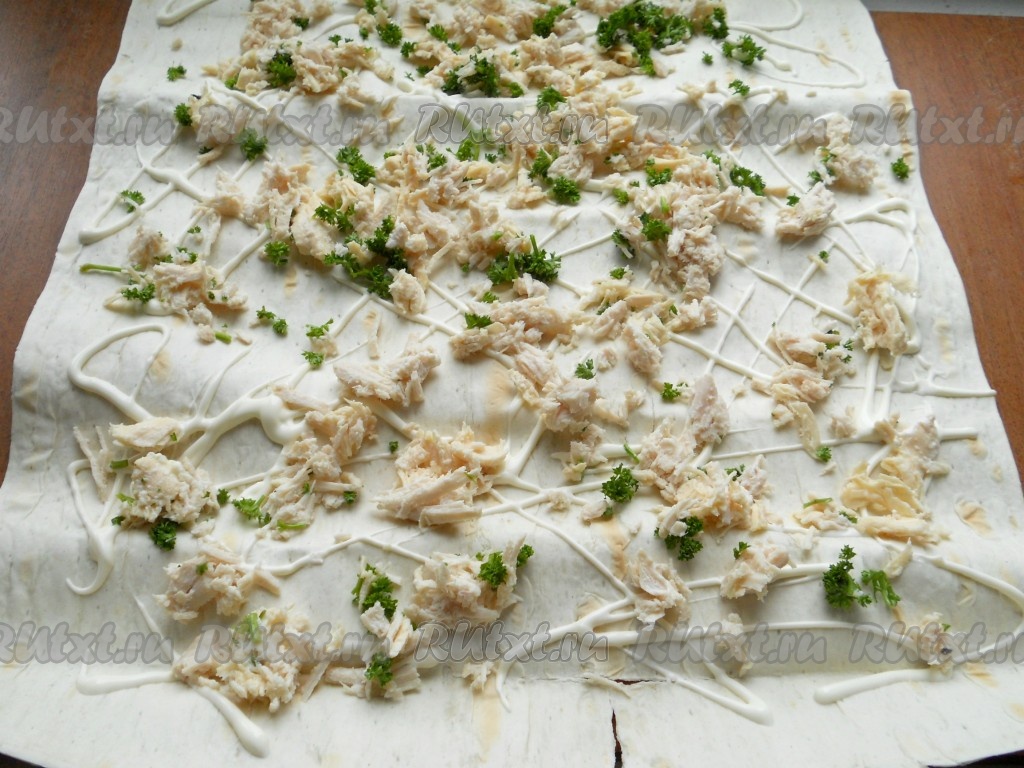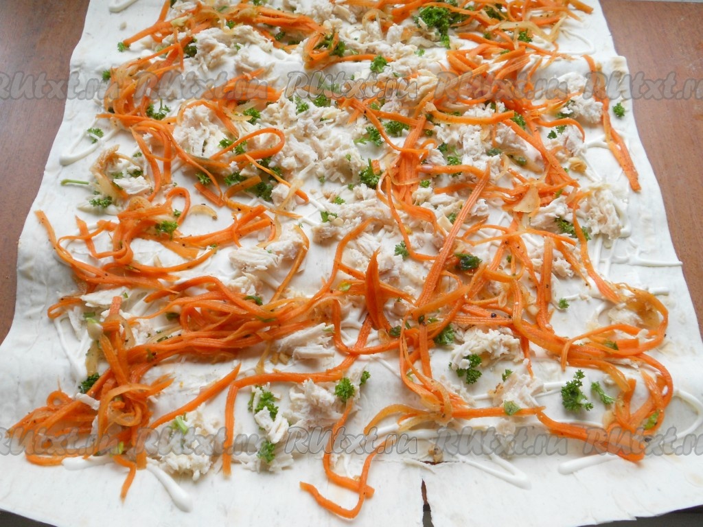 Затем сверху поместить второй лист лаваша, придавить его рукой. Далее все повторить: сеточка майонеза, курица с петрушкой и морковь. Свернуть лаваш с начинкой в плотный рулет, сухие концы отрезать.